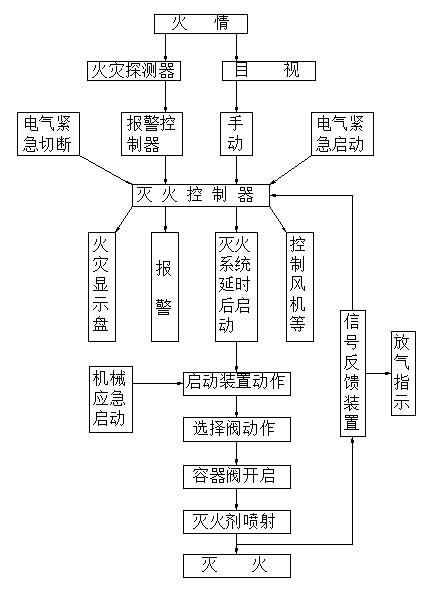 1、 自动状态下,当防护区一路探测器发出火灾信号时,声光报警器报警,提醒工作人员注意;当第二路探测器亦发出火灾信号后,自动灭火控制器开始进入延时阶段(0~30S可调),同时发出联动指令,关闭联动设备(通风空调、防火卷帘等)。延时过后,向该保护区对应的启动瓶发出灭火指令,电磁驱动阀动作,启动灭火系统,灭火剂经管网释放到防护区内,实施灭火。控制器面板喷放指示灯亮,同时,控制器接收到反馈装置的反馈信号,防护区门灯显亮,避免人员误入。